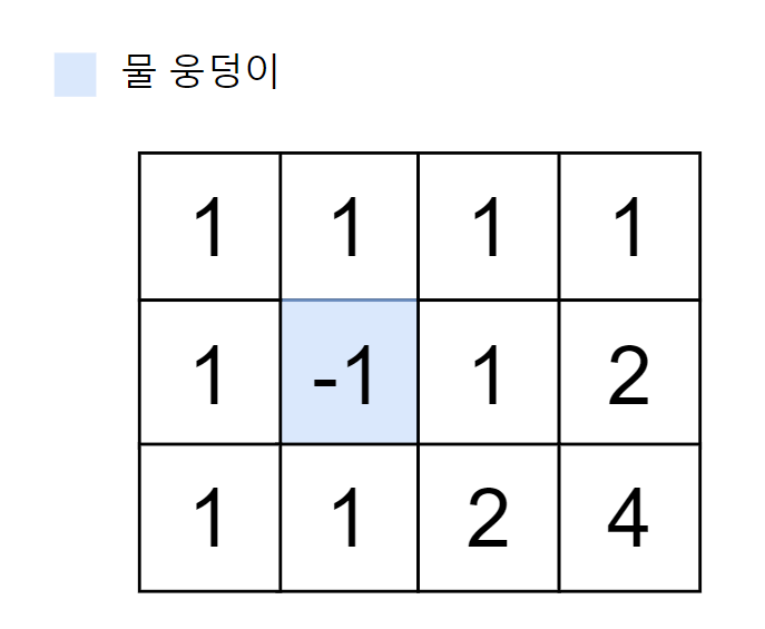 물 웅덩이가 있는 곳을 나는 -1로 채워주고 그곳은 탐색하지 않게 했다.