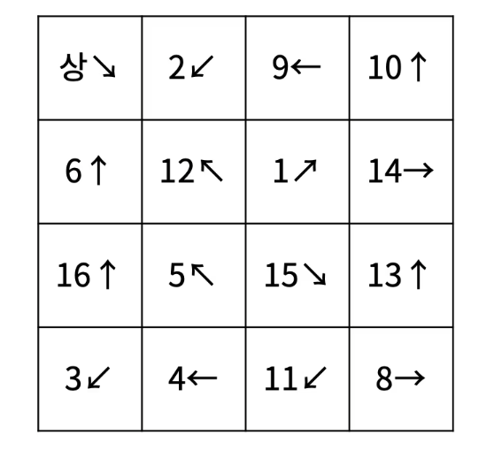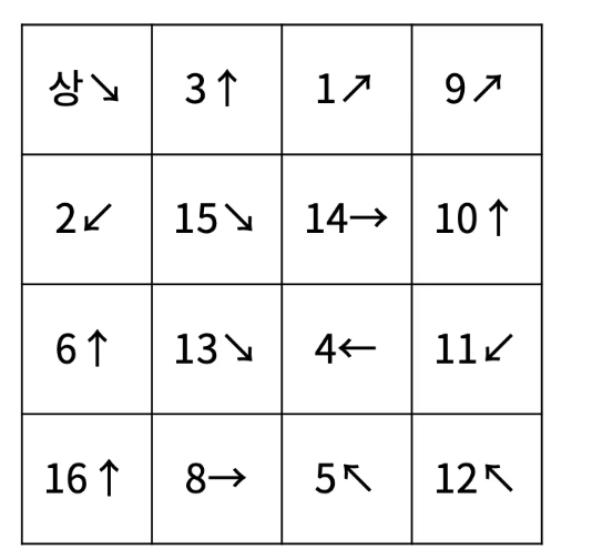 4×4크기의 공간이 있고, 크기가 1×1인 정사각형 칸으로 나누어져 있다. 공간의 각 칸은 (x, y)와 같이 표현하며, x는 행의 번호, y는 열의 번호이다. 한 칸에는 물고기가 한 마리 존재한다. 각 물고기는 번호와 방향을 가지고 있다. 번호는 1보다 크거나 같고, 16보다 작거나 같은 자연수이며, 두 물고기가 같은 번호를 갖는 경우는 없다. 방향은 8가지 방향(상하좌우, 대각선) 중 하나이다.