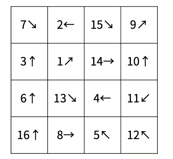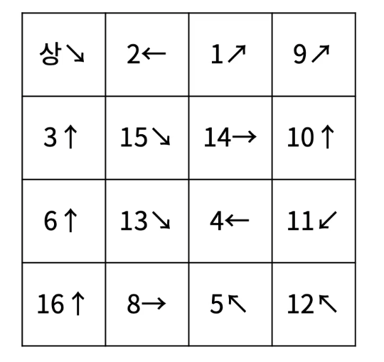 첫째 줄부터 4개의 줄에 각 칸의 들어있는 물고기의 정보가 1번 행부터 순서대로 주어진다. 물고기의 정보는 두 정수 ai, bi로 이루어져 있고, ai는 물고기의 번호, bi는 방향을 의미한다. 방향 bi는 8보다 작거나 같은 자연수를 의미하고, 1부터 순서대로 ↑, ↖, ←, ↙, ↓, ↘, →, ↗ 를 의미한다.