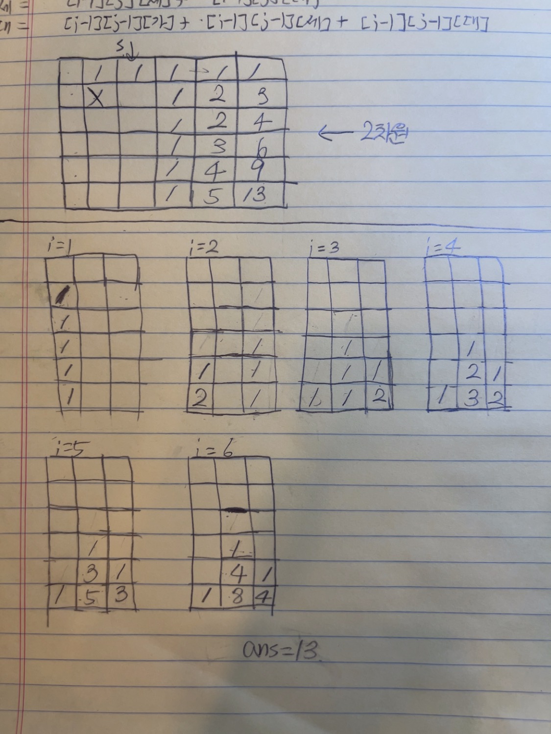 사실 2차원 부분은 아까 화살표 그림을 그냥 숫자로 경우의 수를 옮겨준 부분인데, 여기서 나의 아이디어가 잘 못 되었다는 것을 깨달았다.